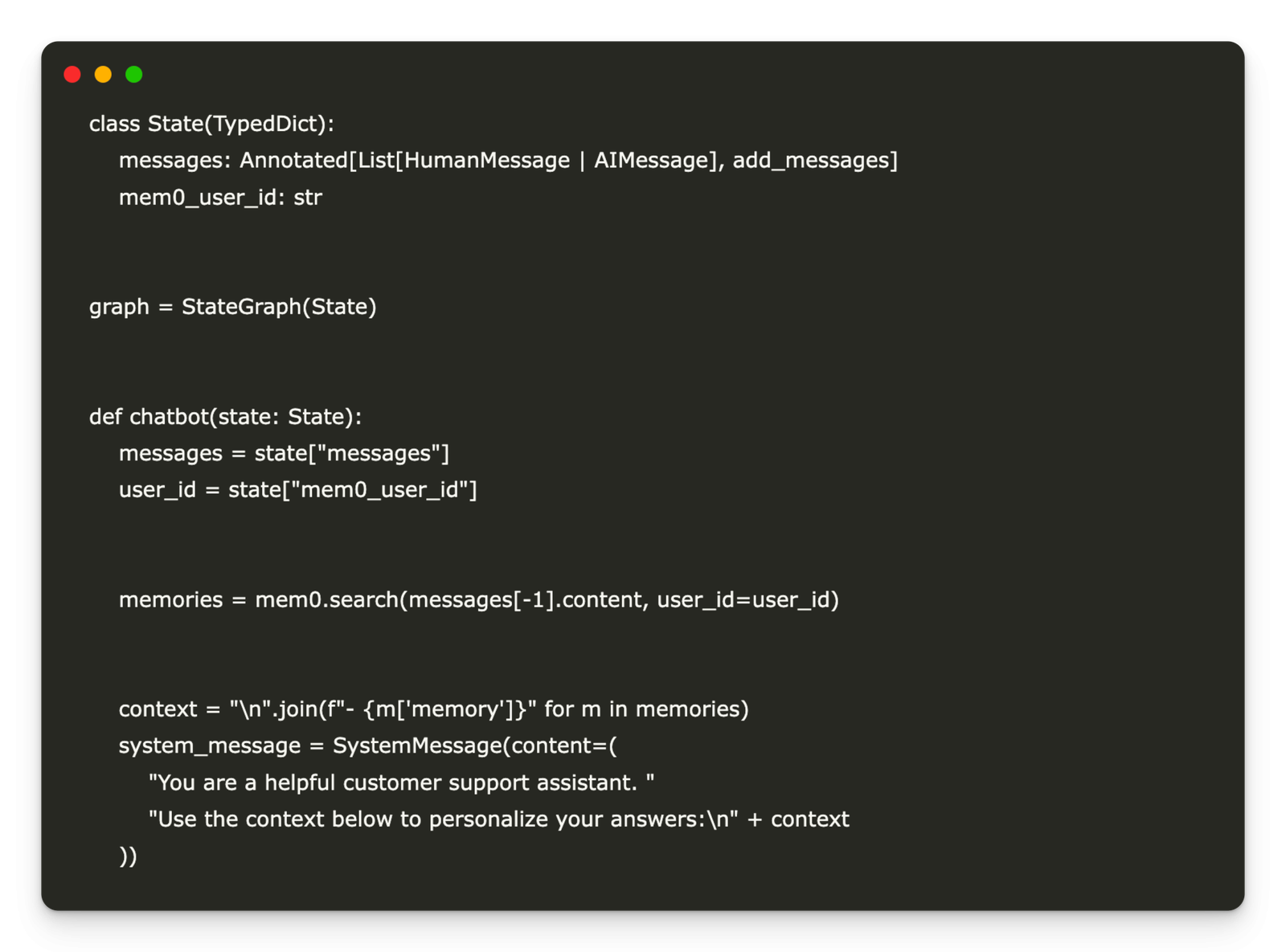 We define the conversational state schema and wire it into a LangGraph state machine: the State TypedDict tracks the message history and a Mem0 user ID, and graph = StateGraph(State) sets up the flow controller. Within the chatbot, the most recent user message is used to query Mem0 for relevant memories, a context-enhanced system prompt is constructed, Claude generates a reply, and that new exchange is saved back into Mem0 before returning the assistant’s response.