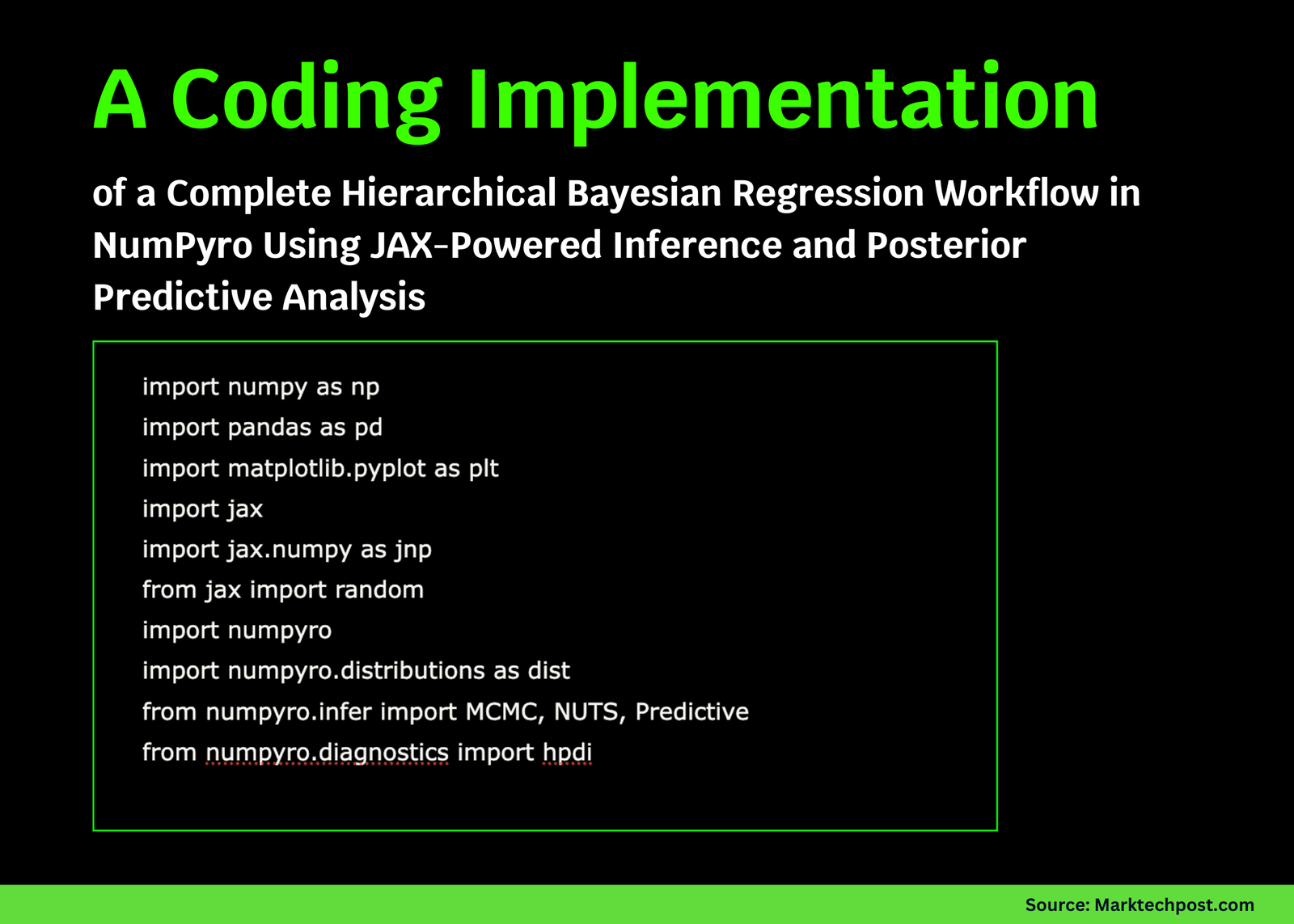 In this tutorial, we explore hierarchical Bayesian regression with NumPyro and walk through the entire workflow in a structured manner. We start by generating synthetic data, then we define a probabilistic model that captures both global patterns and group-level variations. Through each snippet, we set up inference using NUTS, analyze posterior distributions, and perform posterior predictive checks to understand how well our model captures the underlying structure. By approaching the tutorial step by step, we build an intuitive understanding of how NumPyro enables flexible, scalable Bayesian modeling. Check out the Full Codes here.