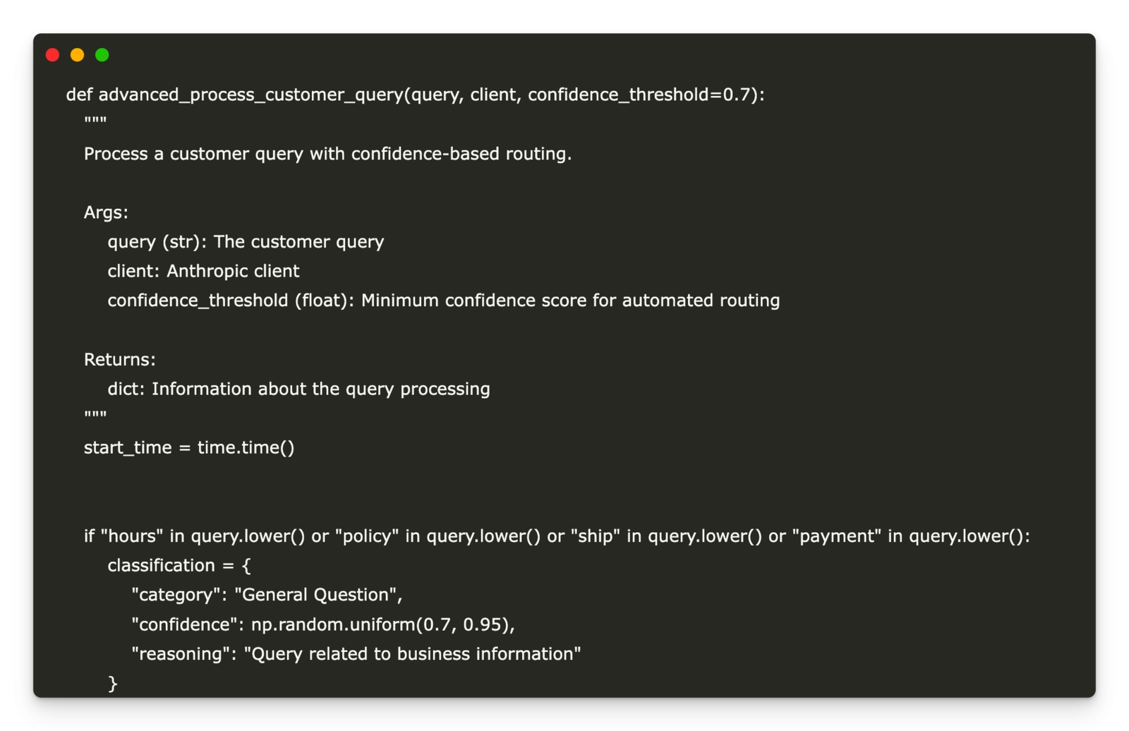 This intelligent request routing system demonstrates how Claude models can efficiently classify and handle diverse customer queries. By implementing category-specific handlers with appropriate model selection, the system delivers tailored responses while maintaining high accuracy. The confidence-based routing with escalation paths ensures complex queries receive specialised attention, creating a robust, scalable customer service solution.