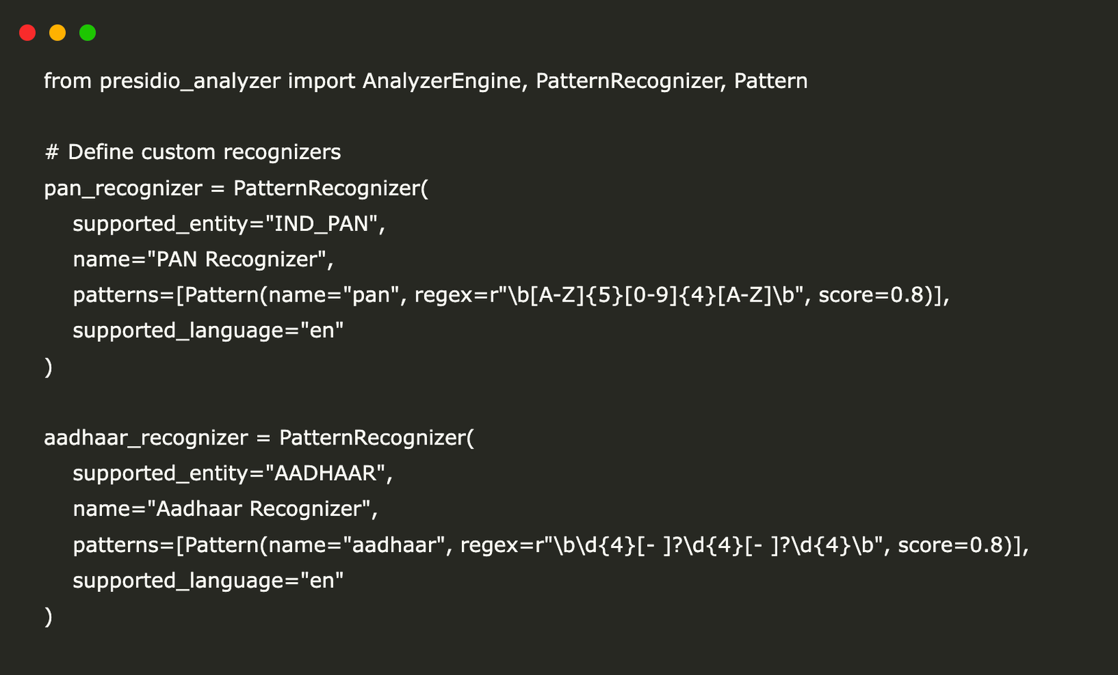 We define two custom regex-based PatternRecognizers — one for Indian PAN numbers and one for Aadhaar numbers. These will detect custom PII entities in your text.