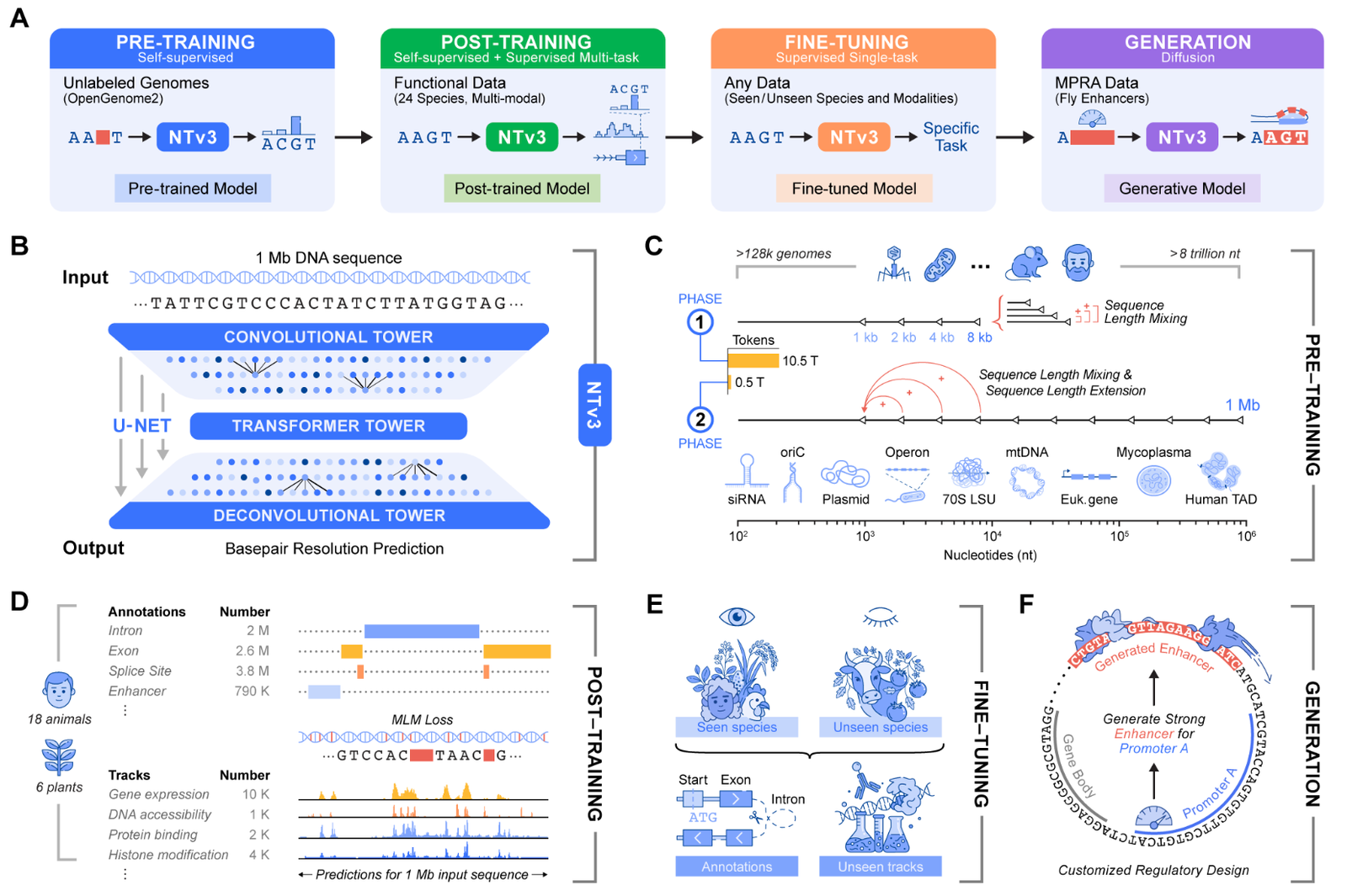 1. NTv3 is a long range, multi species genomics foundation model: It unifies representation learning, functional track prediction, genome annotation, and controllable sequence generation in a single U Net style architecture that supports 1 Mb nucleotide resolution context across 24 animal and plant species.