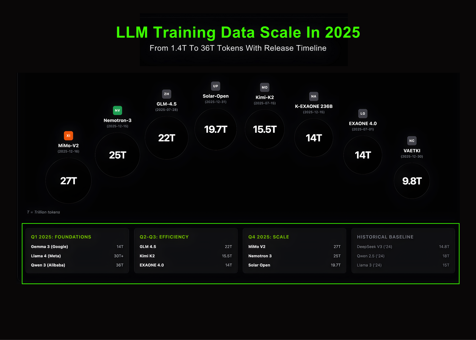 LLM Training Data Scale in 2025: token scale with timeline alignment