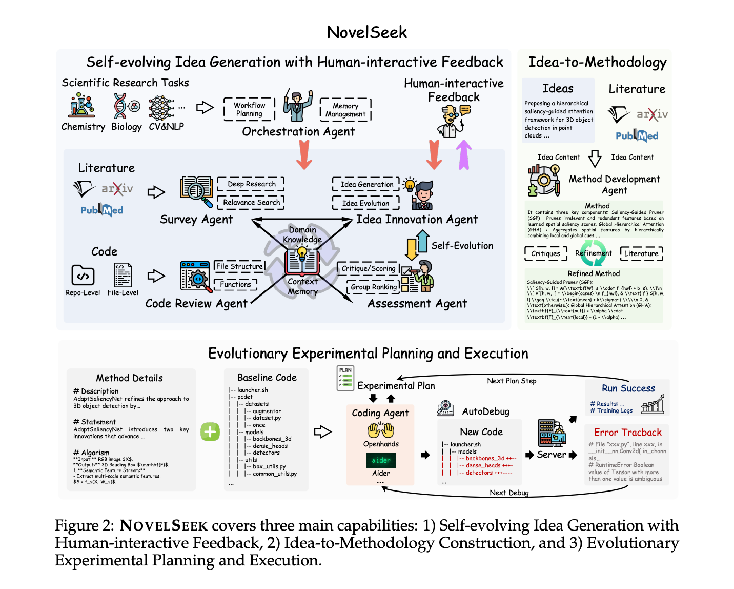 - NovelSeek includes agents for literature search, code analysis, idea generation, and experiment execution.
