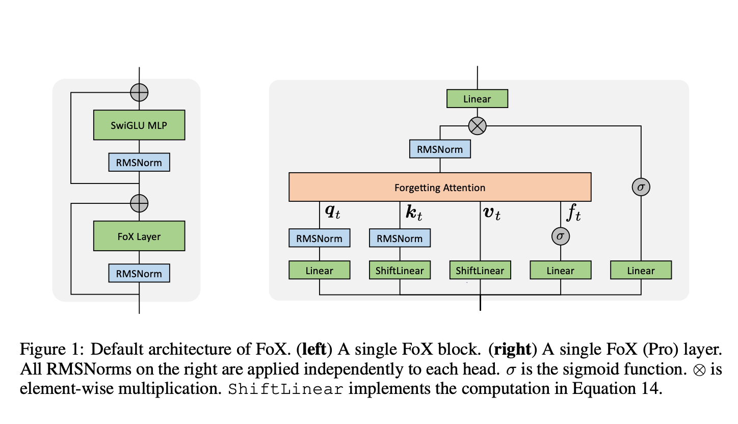 - FoX introduces Forgetting Attention, enhancing standard softmax attention with learnable forget gates.