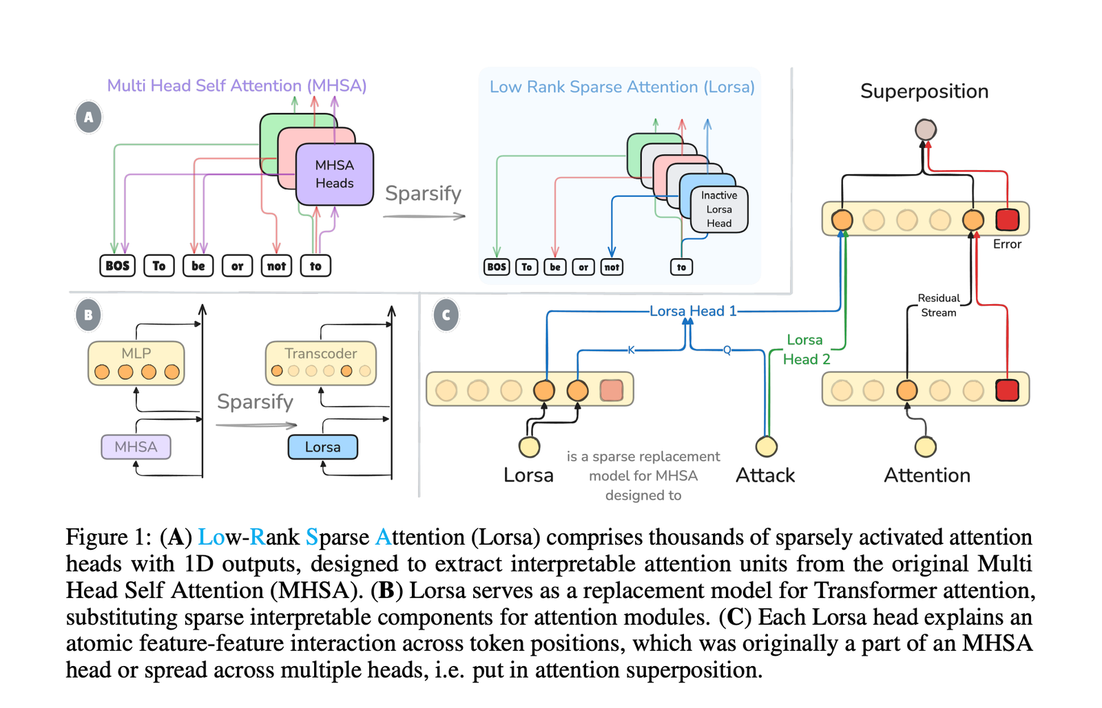 Lorsa employs orders of magnitude more heads than standard MHSA while activating only a small subset per token. For each position, Lorsa’s output aggregates only the top-K heads with the largest activation values, with the active head subset varying dynamically across token positions. This approach resembles TopK-SAEs, selecting the most salient linear components. While similar to attention Sparse Autoencoders, Lorsa differs in that its head activations derive from attention patterns of previous tokens rather than simple linear encoders with ReLU.