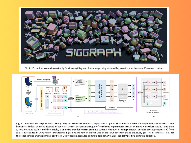 PrimitiveAnything is a framework developed by researchers from Tencent AIPD and Tsinghua University that redefines shape abstraction as a primitive assembly generation task. It introduces a decoder-only transformer conditioned on shape features to generate sequences of variable-length primitives. The framework employs a unified, ambiguity-free parameterization scheme that supports multiple primitive types while maintaining high geometric accuracy and learning efficiency. By learning directly from human-designed shape abstractions, PrimitiveAnything effectively captures how complex shapes are broken into simpler components. Its modular design supports easy integration of new primitive types, and experiments show it produces high-quality, perceptually aligned abstractions across diverse 3D shapes.