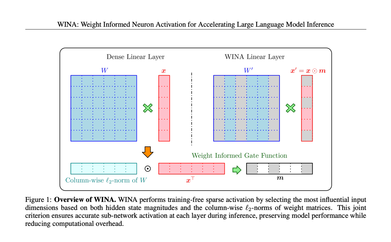Researchers from Microsoft, Renmin University of China, New York University, and the South China University of Technology proposed a new method called WINA (Weight Informed Neuron Activation) to address these issues. WINA introduces a training-free sparse activation technique that uses both hidden state magnitudes and column-wise â„“2 norms of weight matrices to determine which neurons to activate during inference. By considering the combined impact of input magnitudes and weight importance, WINA creates a more effective sparsification strategy that adapts to different layers of the model without requiring retraining or fine-tuning.